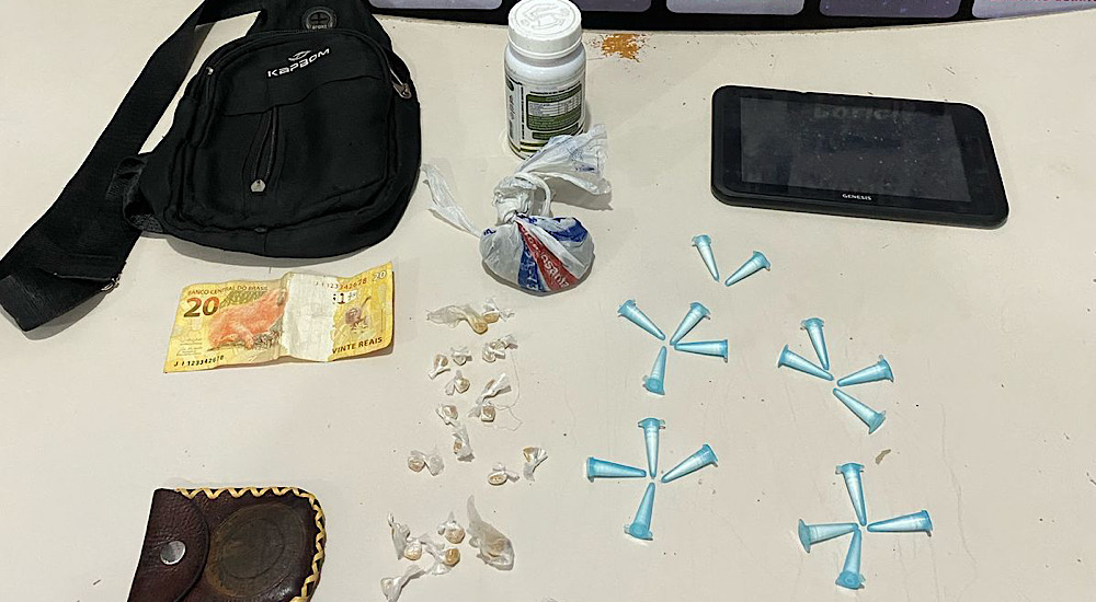 Durante a busca pessoal, foram encontrados em sua pochete 21 pedras de crack, 18 pinos de cocaína, uma porção de maconha, um tablet da marca Genesis e R 20,00 em dinheiro.